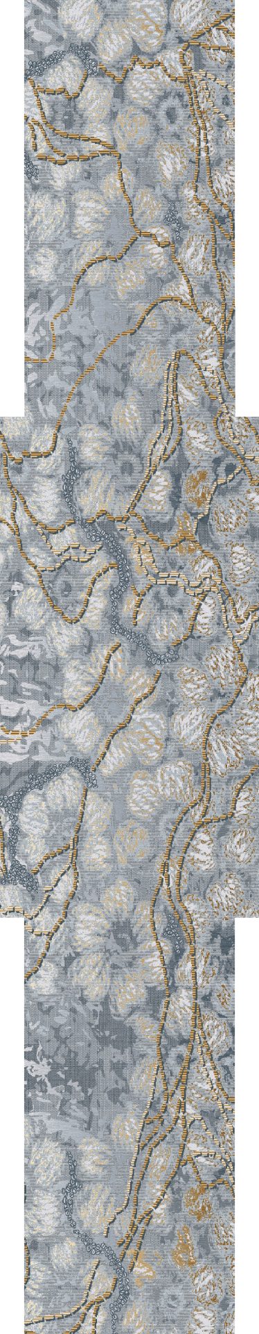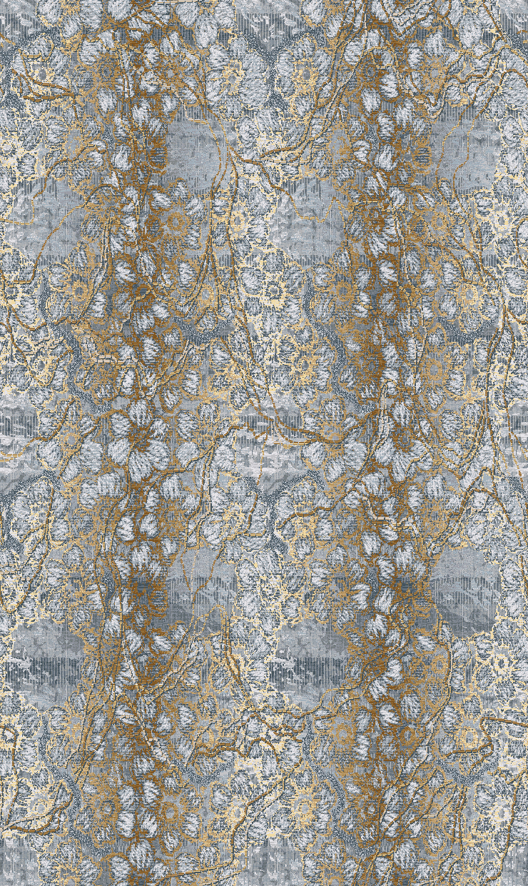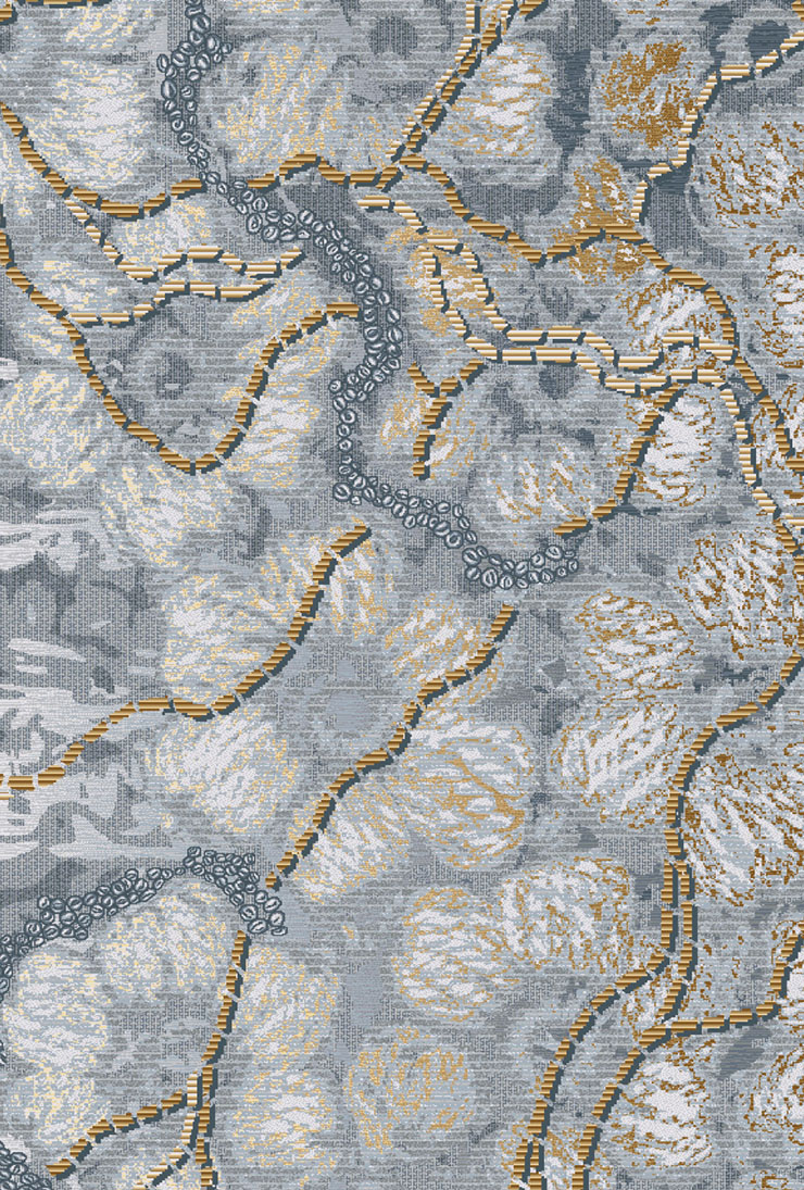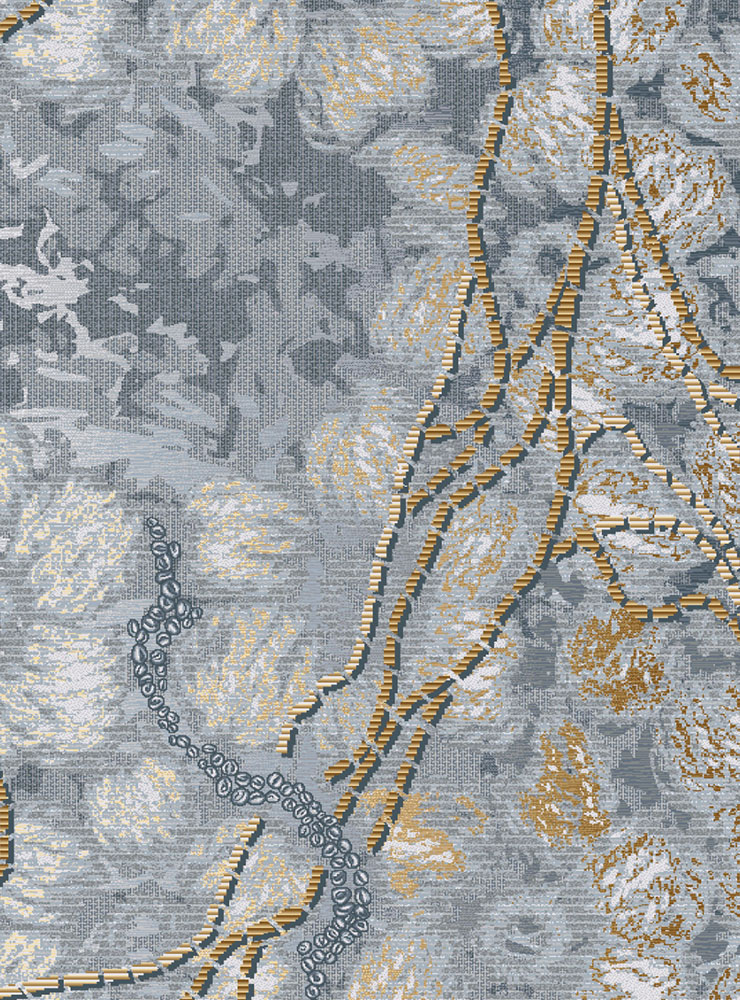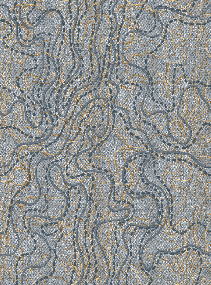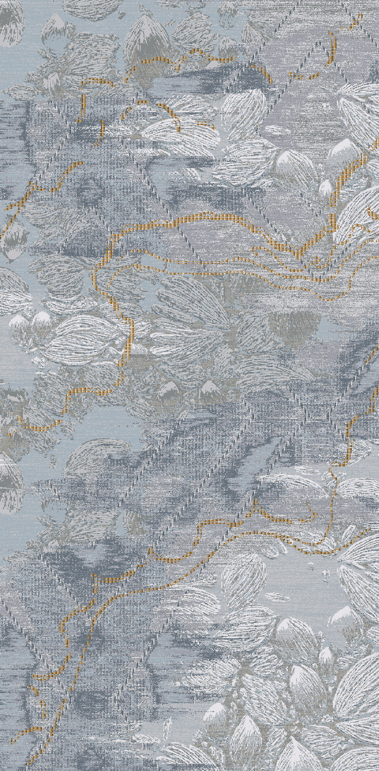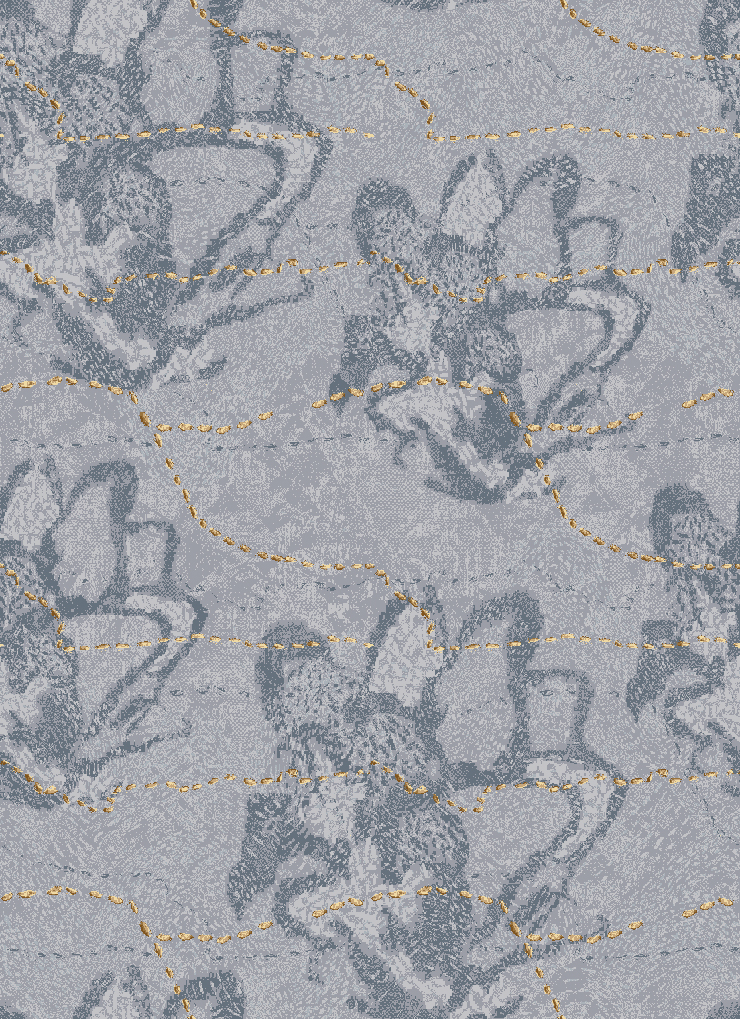 We considered the many treatments available to our creativity, from machine and hand embroidery, AI and digital applications. Here the humble thread becomes the designer’s creative mark and expression. The different effects created by silken-spun filaments, and sparkling tactility, become the motifs with which to grace our floors.