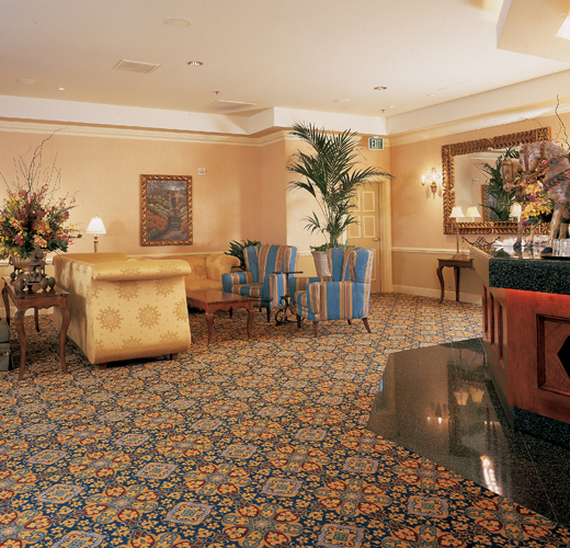 The suitability of Couristan’s ColourOptics Print program for installations, where large repeats with less seams are required, is amply demonstrated by these exuberant Eastern influenced designs created by renowned architecture and interior design firm BBGM based in Washington D.C.. Nearly 20,500 square yards of Couristan ColourOptics Print program carpets, the printed equivalent to our Omni Weave Axminster program, are featured in a variety of locations throughout this lavish project.