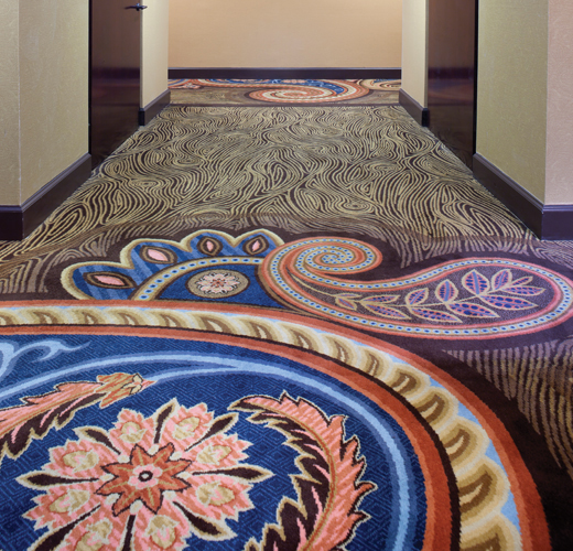 The Omni Austin Hotel Downtown in Austin, Texas is an appointed luxury hotel that surrounds visitors with comfort and style while boasting their well-appointed accommodations, and featuring spectacular views of the thriving city. Offering a modern twist to the property, Pickard Design Studio and Leo A. Daly in Dallas, Texas used their design expertise to create a classical paisley pattern, embellished within a unique background, inspired by a natural wood grain pattern. The combination of the two patterns offered a modern take on décor that looked absolutely spectacular. In order to complete this look for the 1,334 square yards of carpet used, Couristan’s Omni Weave Axminster program was utilized for its precision and quality. The innovative carpets can be found throughout the Resident Corridors and Elevator Sitting areas.