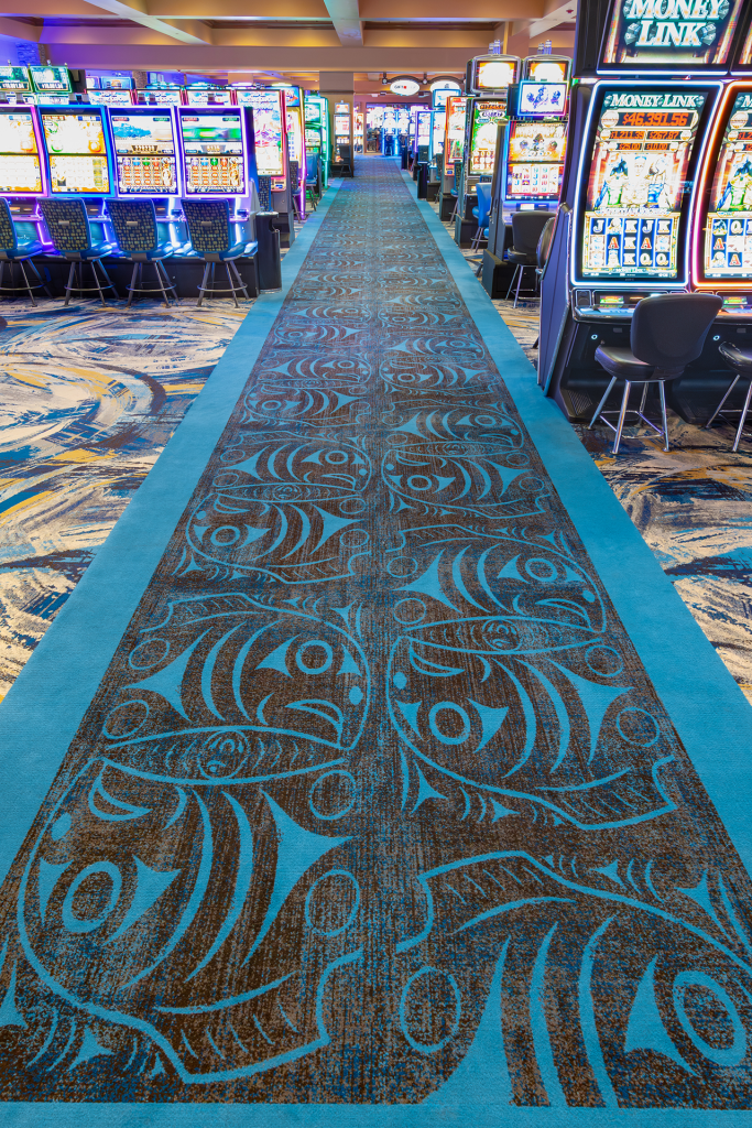 The Silver Reef Casino Resort in Ferndale, Washington, is a stunning example of cultural fusion and modern gaming. This 80,000-square-foot gaming space is part of a larger resort that includes 8 restaurants, 206 luxurious guest rooms and suites, a full-service spa, and an expansive meeting and event center spanning over 30,000 square feet. Owned and operated by the Lummi Nation, the resort’s casino floor underwent a refresh to incorporate the tribe’s rich cultural heritage and connection to the sea and salmon. The Lummi Nation held a contest among tribal member artists, and the pathway fish design was chosen for its historical significance. The expertise of Couristan’s Design Studio and its 80% wool/20% nylon woven Axminster carpet tile program was called upon to complete the final design element of Casino’s dynamic floor, capturing a beautiful representation of the tribe’s history and traditions.