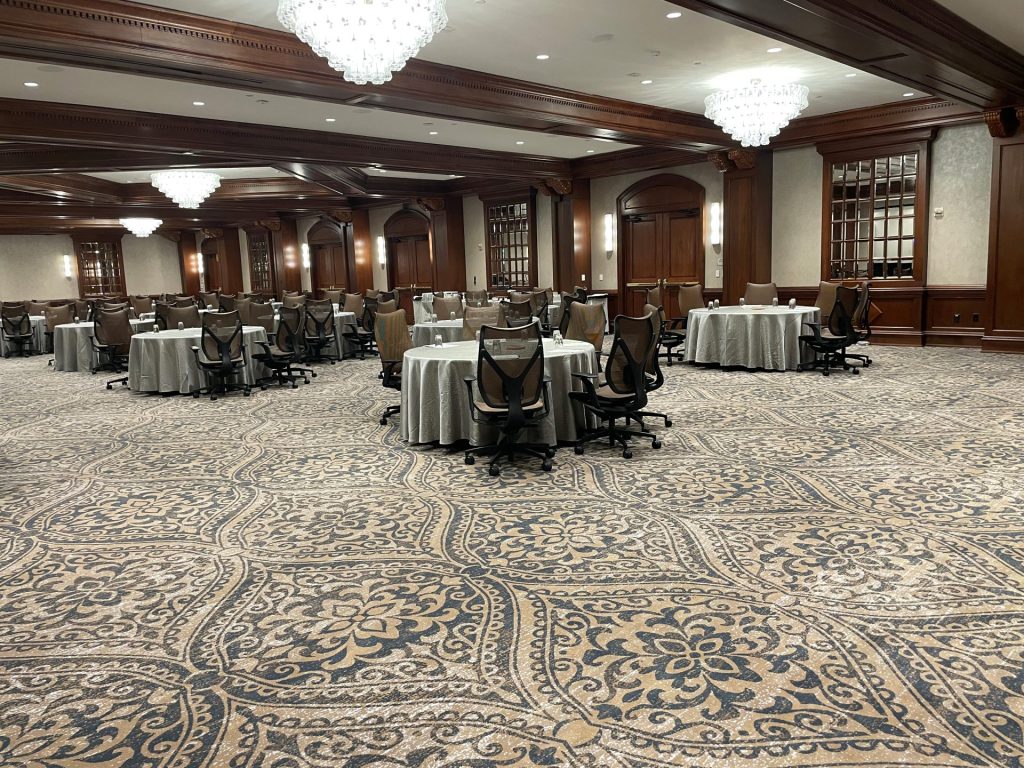 The Houstonian Hotel, Club and Spa, recently voted the best resort in Texas by Travel + Leisure readers, features 289 deluxe guest rooms. Offering luxury accommodations, award-winning wellness experiences, and exceptional dining, it stands in the heart of Houston. Renowned for its timeless elegance, exquisite décor, and exclusive Private Fitness Club, The Houstonian holds a historic place in Houston’s events and celebrations. This Four-Star property has recently completed significant renovations, further enhancing the luxury lifestyle experiences across its sprawling wooded grounds. Lead designer Douglas Devtiveaux of Gensler based in Houston, collaborated with The Houstonian, and our Dallas design team to create these custom 80% wool, 20% nylon Axminster woven carpets. The bespoke designs adorn The Houstonian’s Ballrooms, Meeting and Pre-Function Areas, Stairs, and Mezzanine Gallery. Drawing inspiration from the property’s natural landscape, the carpets showcase a series of versatile palettes, including soft tones of gold and taupe, as well as rich blues, creams, and browns. This thoughtful refresh pays heartfelt tribute to the Houstonian’s enduring legacy, which is deeply rooted in Texas tradition.